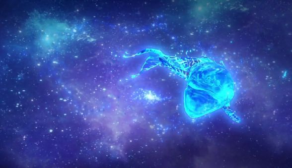 一只小蓝鲸在悬浮汇聚的水之元素中摆动着扇形的尾巴,如鲲鹏浮游天地,脱离了重力的束缚,朝着冰路飞去。