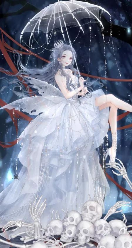白骨为架,蛛丝为织,撑着把白骨伞的白朵朵笑吟吟的踏着黑暗和满地从地下浮出的头骨款款走来,姝丽的容颜上,一红一银的异色瞳眸笑吟吟的注视着他们,勾起的唇瓣仿佛涂上了一层鲜血,红的妖冶。