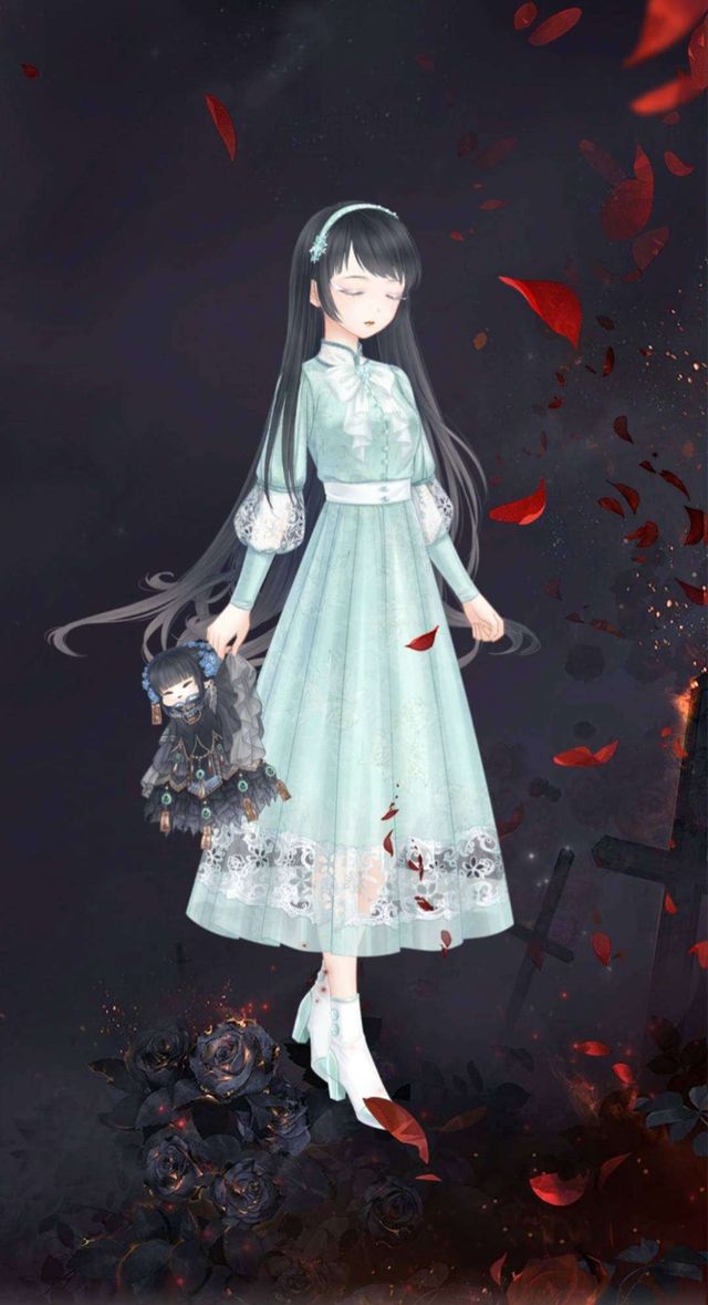 她的怀中抱着一个穿着黑色繁复长裙的人偶娃娃,人偶娃娃同样惨白的脸上,表情是闭着眼沉睡的模样,看起来无端显得有些诡异。