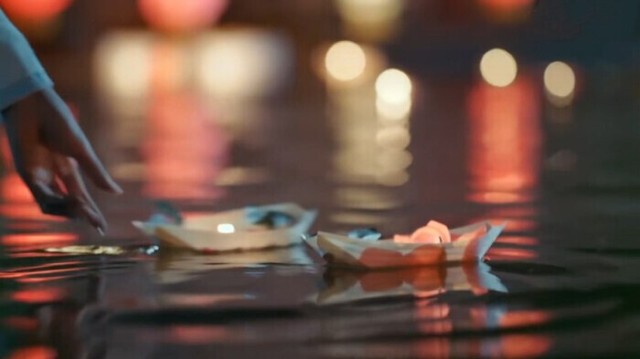 两人把花灯放入河中.