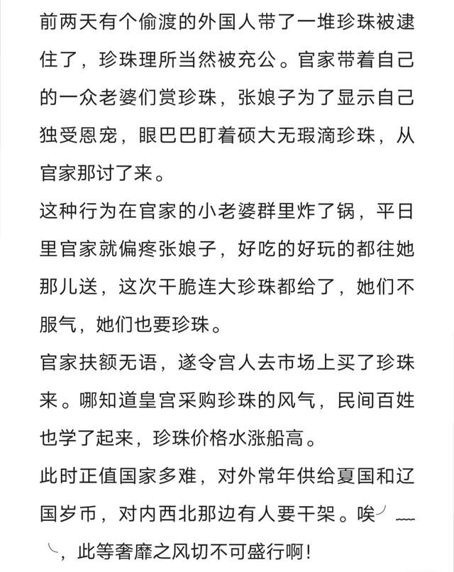 下一部分就是温成用这些珠子制成了冠子 然后戴到了宴会上 仁宗看见了就训斥了一句。然后此事又流传到宫外,于是珠价大减(价格大大降低)了。