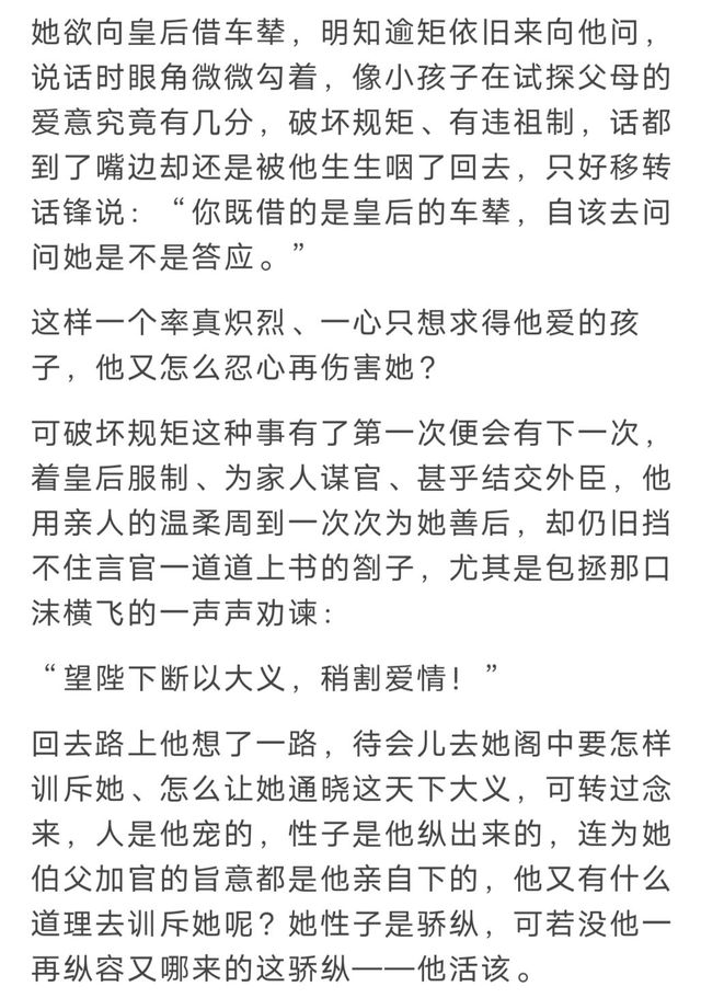 她每次对他使点小性子,娇蛮任性、哭哭,撒撒娇之类,娇美又鲜活的,他都是很喜欢的呀~ 比如还有那一集官家来贵妃殿里问夏贾的事,她又是使性子,说话也没个避忌,官家也只是一句“慎言”,然后官家说明了只是来问清楚而已,并不是要问罪,马上小张就识相认错、狗腿子彩虹屁吹起来~而官家的反应,你们说他受不受用?(此处还是强烈建议去看这段视频感受)嘿嘿..............