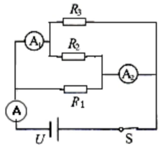 由等效电路可知,R1、R2、R3并联,电流表A1测通过R2和R3的电流之和。电流表A2测通过R1和R2的电流之和。电流表A测通过R1、R2、R3的电流之和,也就是测干路电流,即总电流。