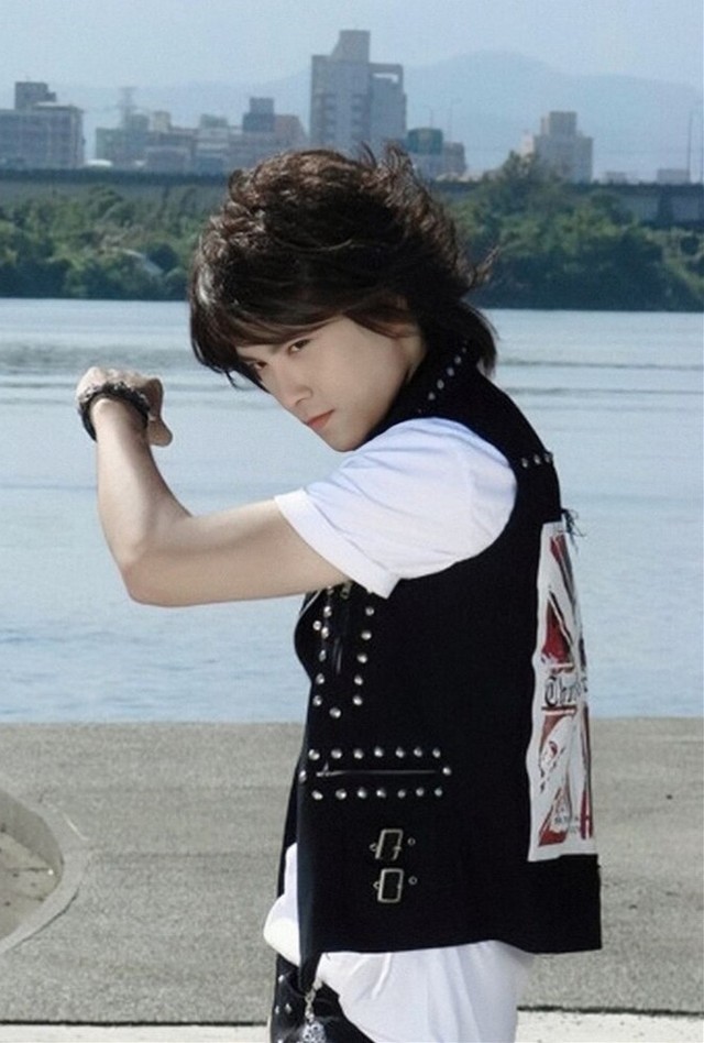 脩穿着一件黑色铆钉外套,里面配着白色T恤,下面一条黑色工装裤