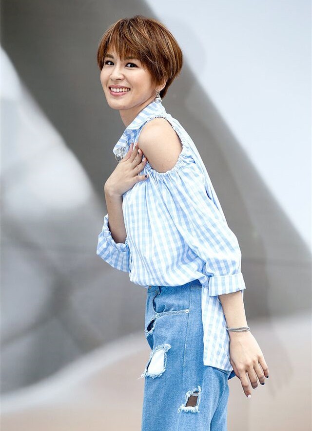 阿香穿着一件蓝白条纹露肩衬衫,一条破洞牛仔裤