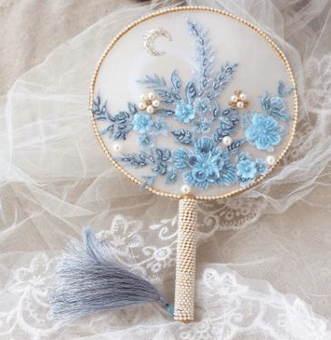 巨蟹座--古典优雅淡蓝色刺绣捧花扇