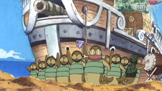 芙莉娅换完衣服出来就看到叼着食物的功夫海牛向路飞他们挥别