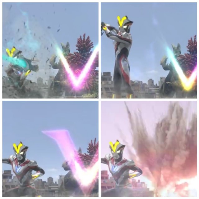 维克特利·奥特曼:切!![跳在半空中,挥出V字型斩击画在两只超兽的身上]
