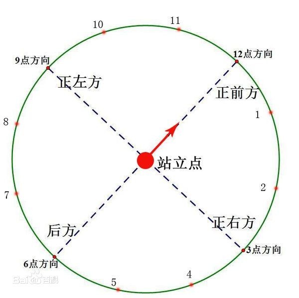 在军队上,经常需要让某个队员知道自己的目标在什么地方,所以发明了一套“几点钟”方向这样的集体行动术语了。 首先要确定站立点,以站立点为圆心以时钟12个小时的点位来定的方向,就是几点钟方向。