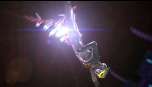 洛琳娜电击了贝利亚的手,跑去拿到赛罗的变身器,丟向赛罗