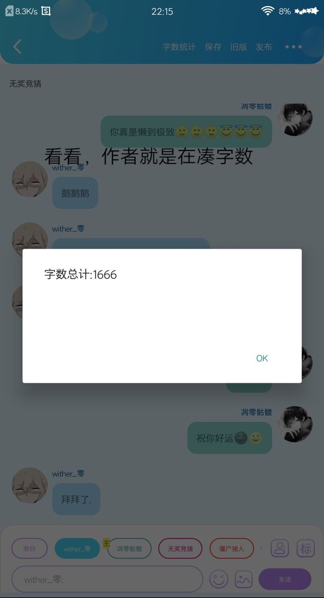 零儿(作者):现在是现实时间22.10分,在他们的时间观里,他们相当于猜了一个小时🌚🙂