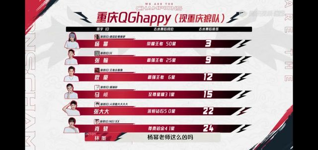 关妤·狗狗:“好,现在我们现在宣布大家的分队名单以及去水后排名和段位”