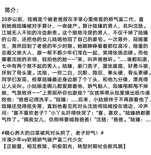 周柯宇是光。:故事的开始是陆嫣重生回到了她爸的学生时代遇到了她爸的死对头.故事的结尾是40岁的沈括向20岁的陆嫣求婚.