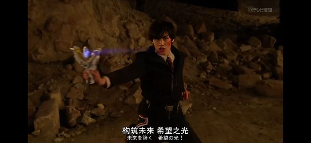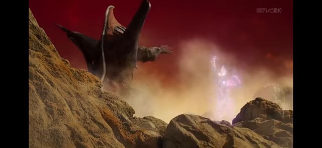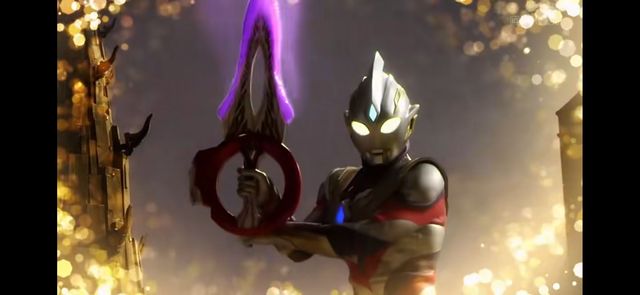 最后,在遗迹底下封印的剑钻出地底向特利迦手中而去