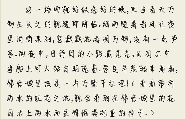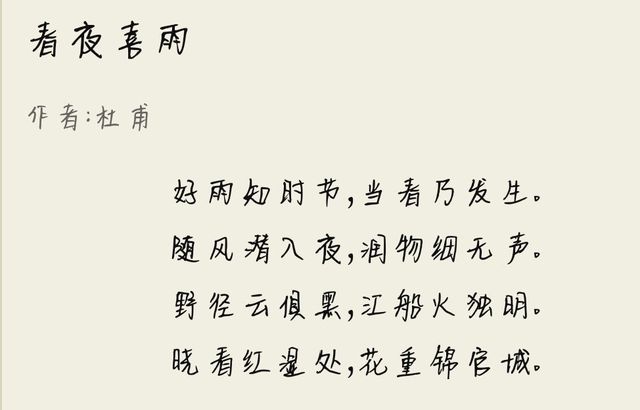 王默:好雨知时节, 当春乃发生。 随风潜入夜, 润物细无声。 野径云俱黑, 江船火独明。 晓看红湿处, 花重锦官城。