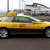 一辆汽车风驰电掣的行驶在公路上,车上赫然印着GuTS的字样。