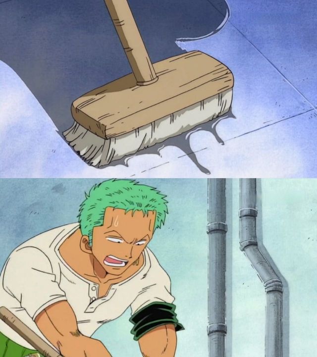 对于一个三刀流的剑士来说,那三把刀和三个拖把,都是一样的。一把含在嘴里,另外两把拿在手里,刷刷刷的几下,就把这地给拖的干干净净了。果然,优秀的人不管干什么都是非常优秀的,索隆即使是拖个地,也是十分的利索,帅气。