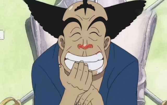 店老板立刻露出诡异又猥琐的表情,露出一排大白牙,奸诈的看着索隆。