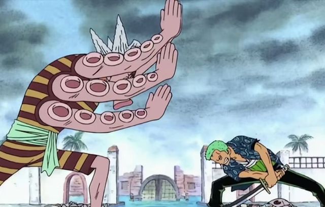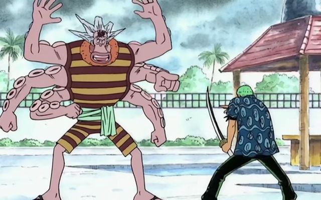 话说章鱼好像就是有这种本事,吸盘可以有力的吸住想要附着的东西,使自己可以紧紧的抓牢。章鱼小八利用的就是自己的品种优势,这样既可以让索隆拿他没辙,又可以拖延时间,让他没那么快去救伙伴。