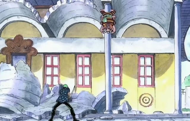 然而索隆这边,却没有山治那边那么顺利。小八轻轻一跳就躲开了索隆的攻击,不仅如此,整个人还倒挂在了石柱上。