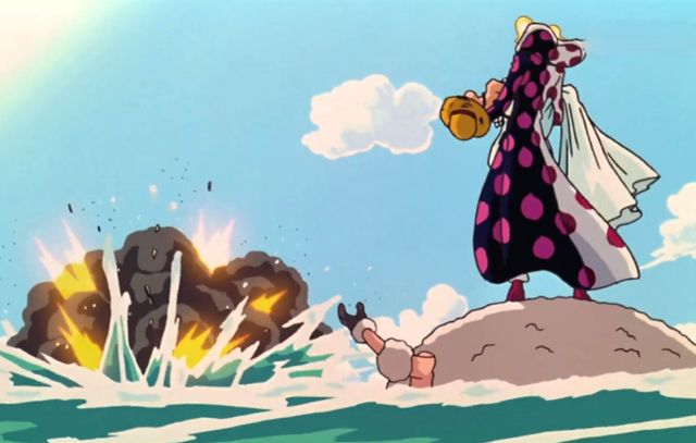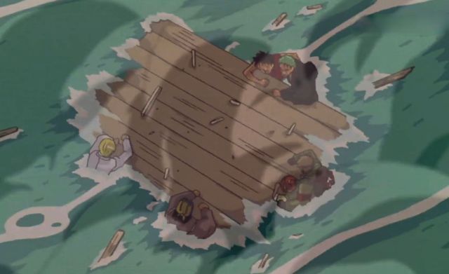路飞一下子就被炸到了水里去,索隆急急忙忙潜下去将路飞救出来。趁着他们手忙脚乱的机会,女人和噗杰克把娜美给带走了。