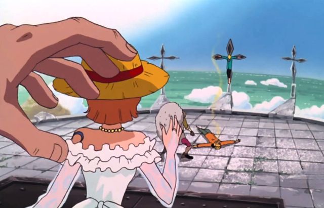 那家伙对待娜美,就像是玩木偶一样,史康克一号腾空而起,他一把将娜美按倒在地上。