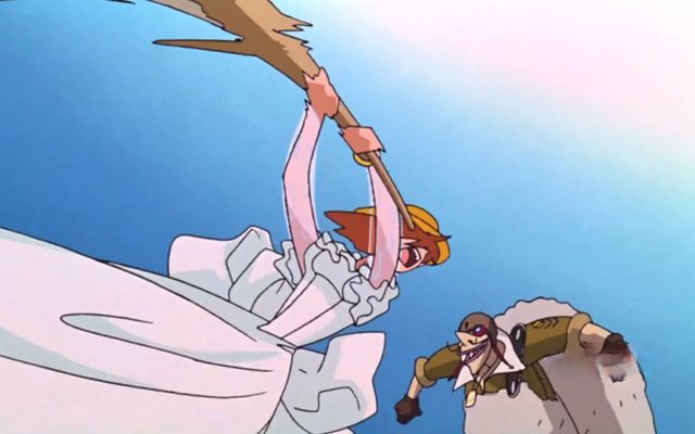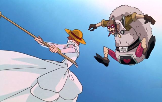 娜美怎么可能放任他们去欺负自己的伙伴呢?娜美抄起身边的一根扫把就上前去要跟那个史康克一号打斗。