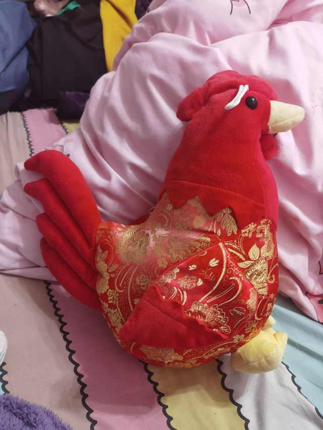 这只大公鸡的嘴巴是黄色的,浑身也都是红色的,身上有一些扎人,因为都是用金线丝绣的过年应有的吉祥花色,有牡丹花,也有各种其他的花,还有福字之类的,总之,看起来就喜气洋洋。
