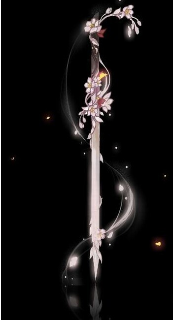 这是一把发着淡紫色光的剑,淡到有些发粉。剑柄雕刻有梅花,梅花开于刻的长藤之上。十分好看,剑身剑锋被紫粉色的光蕴包裹着。