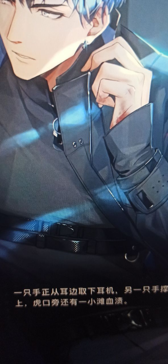 一只手正从耳也取下耳机,另一只手撑在地板上,不可能一滩血渍。