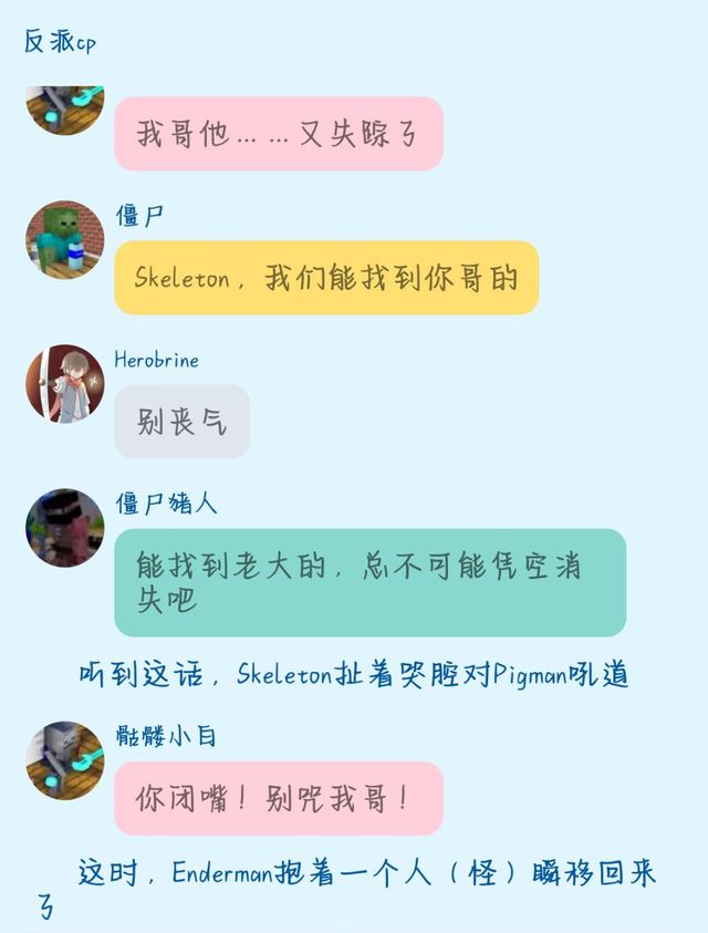 Pigman第二个朝着Wither SK.跑来,原本跟Herobrine讨论事情的Enderman便一直盯着Pigman,房间里醋意更浓了,Wither SK.给Pigman使了个眼色叫他滚远点,Pigman也明白了,自己是抢不过Enderman的