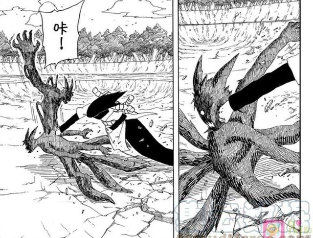 接着再次褪皮,延伸出另一个自己,朝着鸣人的脸就是一拳,原以为这样就能消停,却忘记了鸣人也能如他这般不停的分化,他没有办法,猛地向上窜,接着被鸣人一爪子直接拦腰截断了。