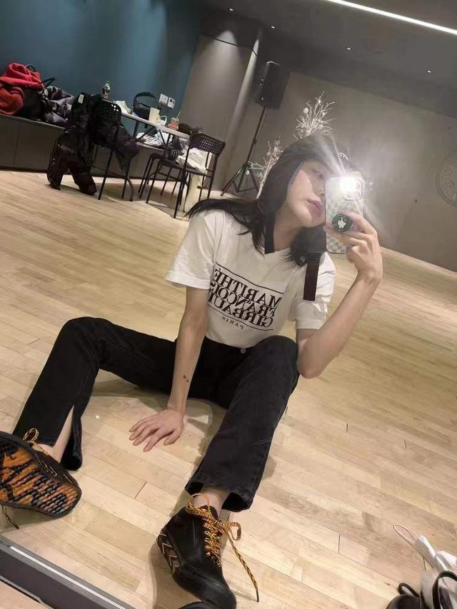 她还发了自己编舞的时候练习室的对镜自拍